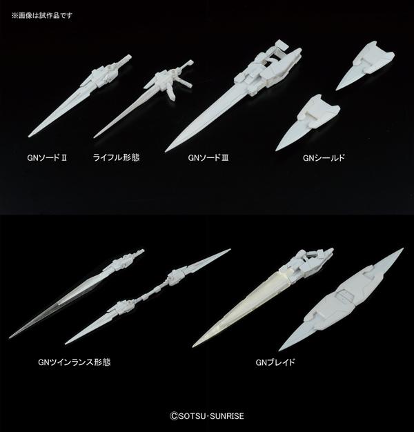 GNソードII、GNシールド、GNソードIII、GNビームサーベルが付属。ジョイントを介して、腰部や肩部等にマウントが可能。各武装を装備して、劇中の剣劇アクションが再現可能。